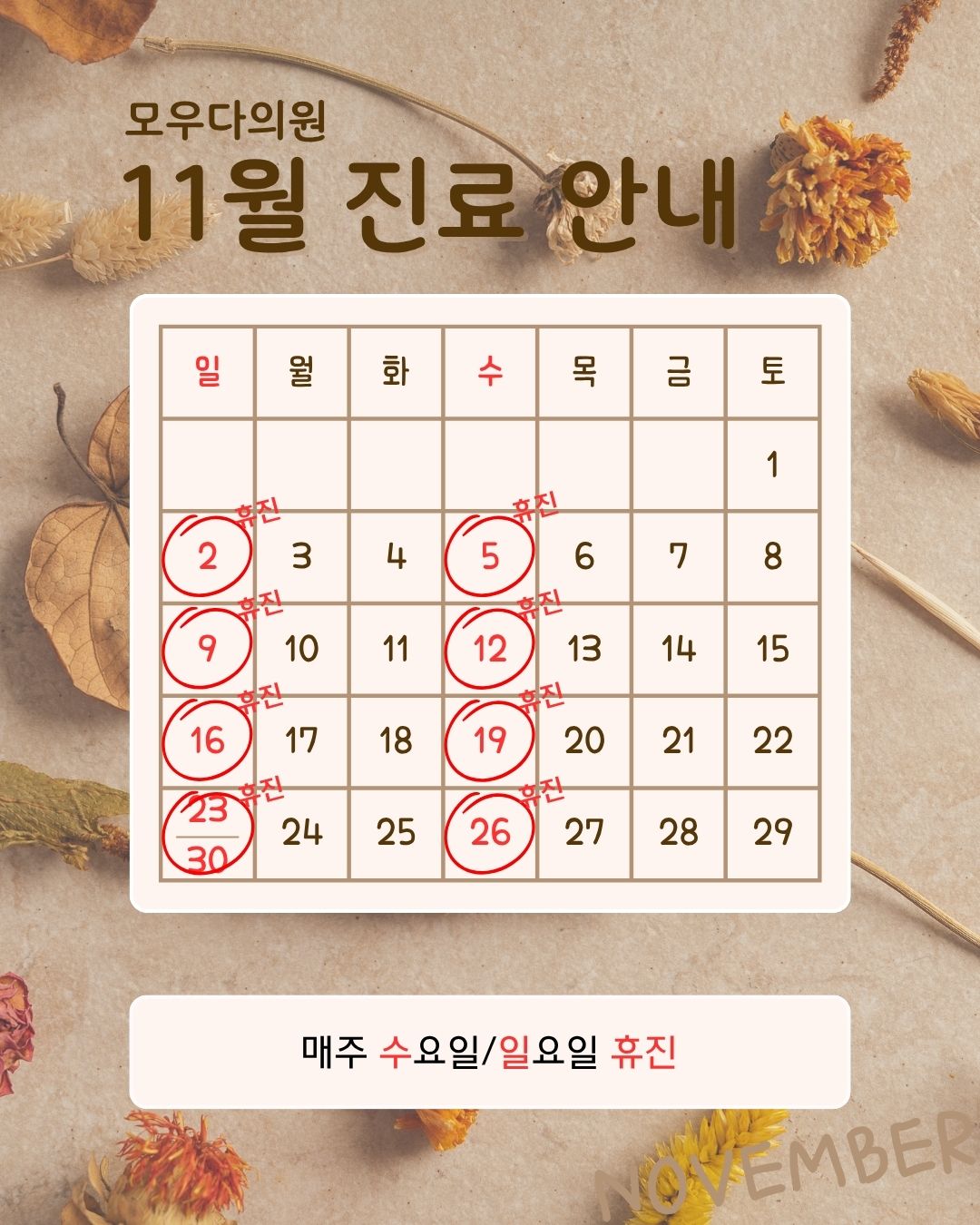 ※ 매주 수요일, 일요일, 공휴일은 휴진합니다.