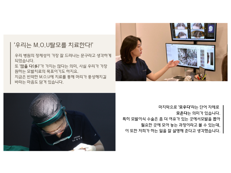 대표적인 세 가지 탈모를 치료하는 의미를 담아 M.O.U를 따오게 되었습니다.